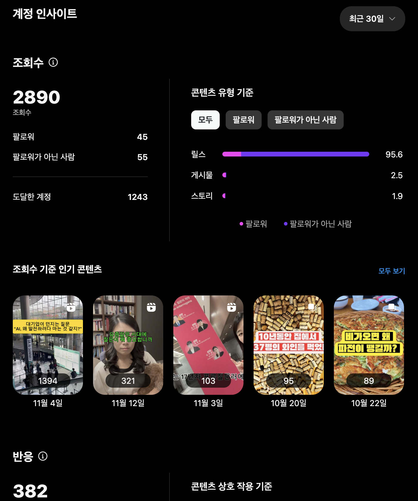 총 25개의 게시물을 만들었고, 2890 조회수를 기록했으며, 팔로워는 45명이지만 내 콘텐츠를 마주친 계정의 수는 1243개다. 릴스를 (각잡고) 처음 만들어봤고, 정보성 계정이라는 것을 빌드해 봤으며(SNS는 그간 나에게 일기장에 불과했었다), 포스팅의 형식이라는 것을 고민해봤고, 레거시의 방법론(시의성이랄까)을 활용해보기도 했다(생각보다 통함). 독자의 마음을 고민했고, 매일매일 콘텐츠를 쌓았으며, 곳곳에서 피드백을 받고, 레퍼런스라는 걸 참고해보기도 했다. 와, 나 엄청 컸네?!